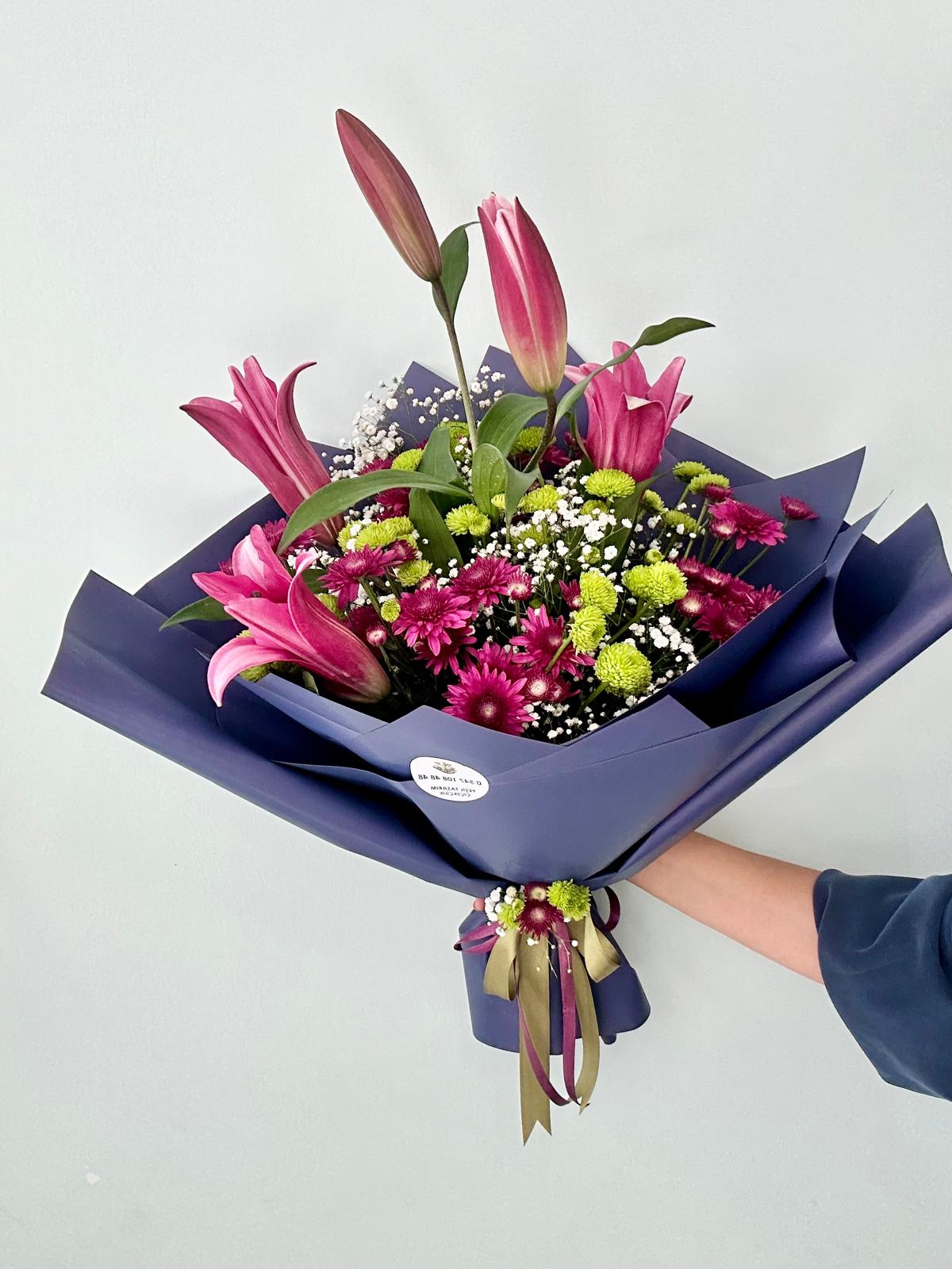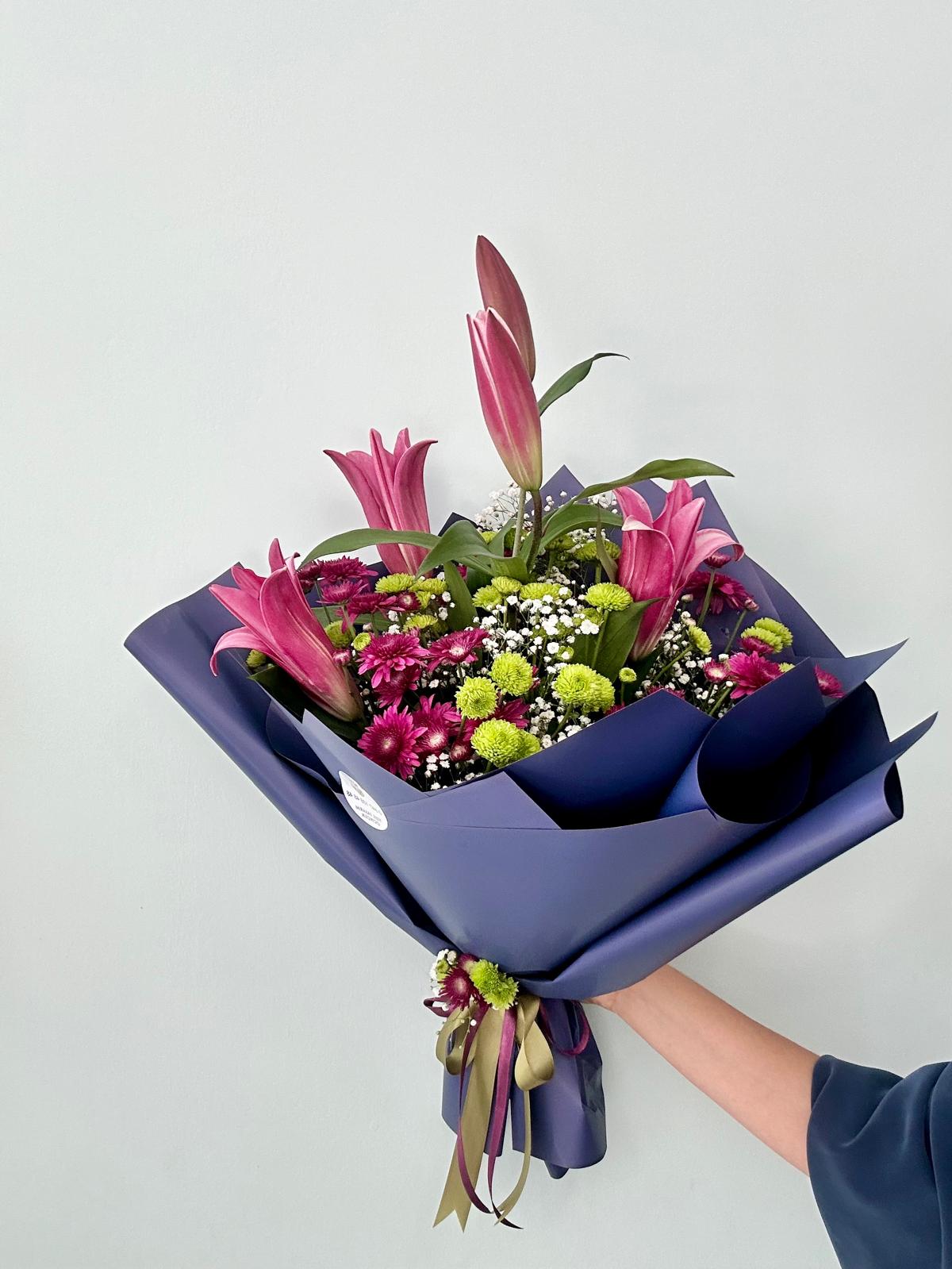 Mor lilyumların asil duruşu, fuşya ve yeşil tonlardaki kasımpatılarla birleşerek bu gösterişli buketi oluşturuyor. Lacivert ambalajı sayesinde modern ve çarpıcı bir görünüm sunan bu tasarım, Fethiye’de özel günlerde etkileyici bir hediye arayanların favorilerinden biridir.